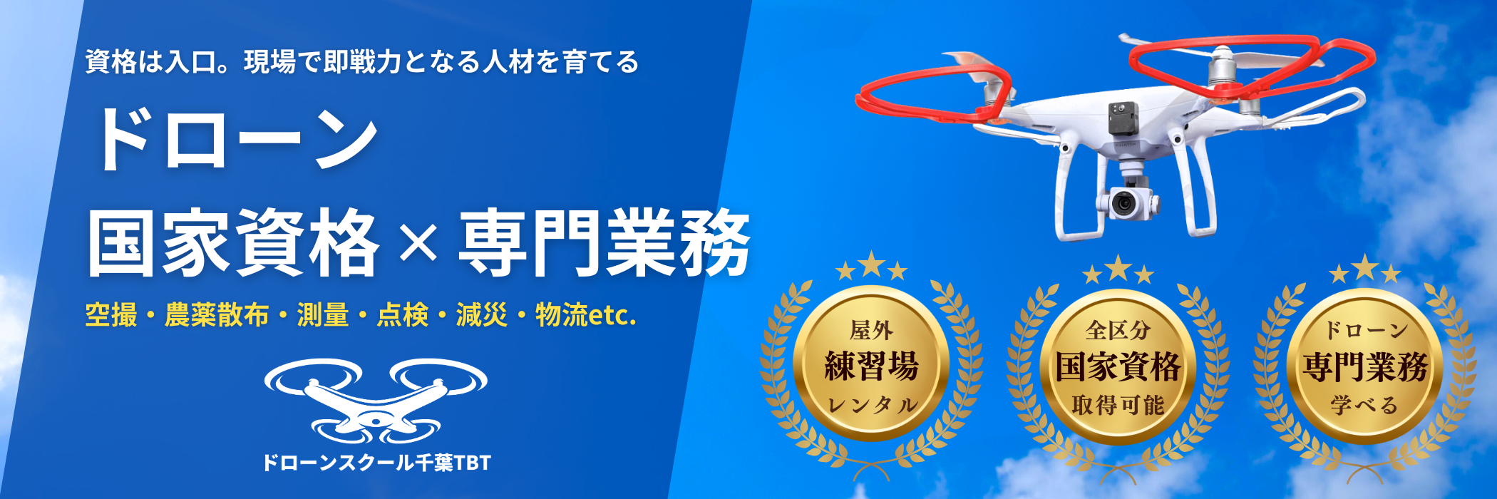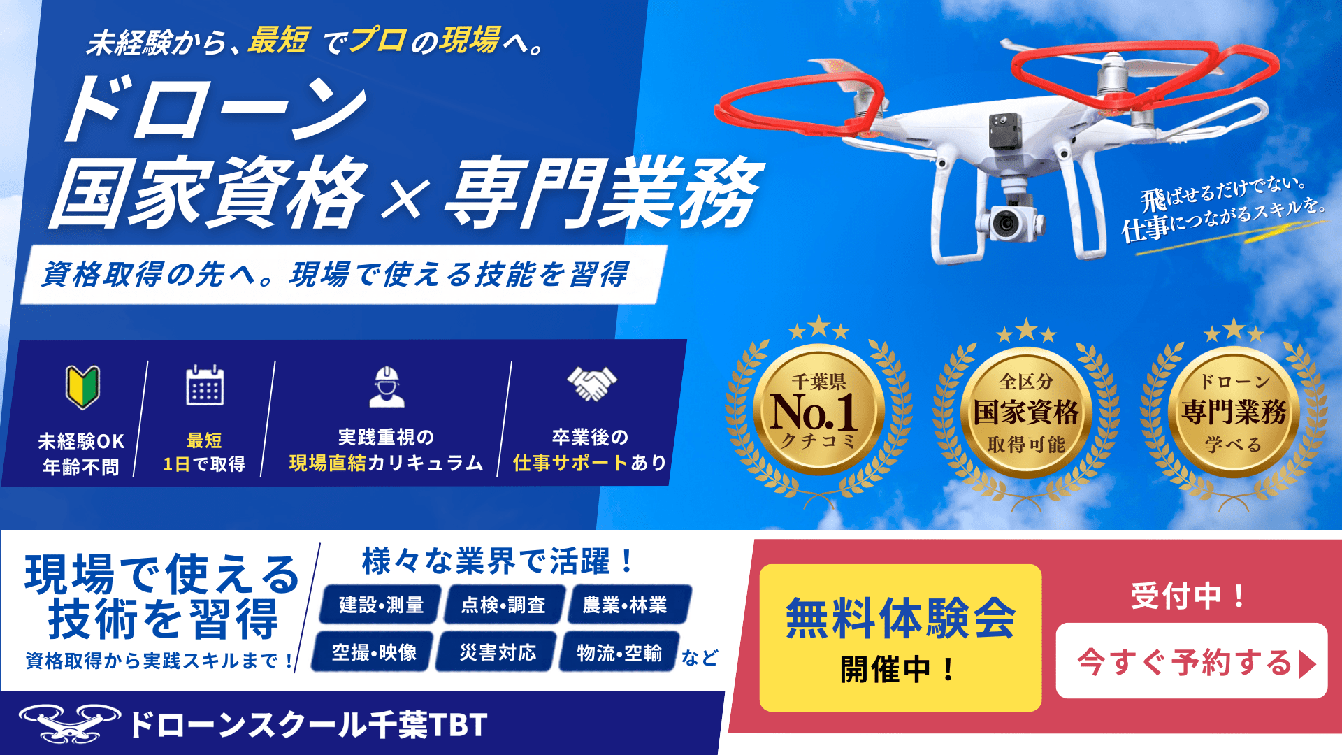 千葉県千葉市にあるドローンスクール千葉TBTは、一般社団法人日本ドローンビジネスサポート協会の加盟校です。国土交通省登録講習機関である同協会のカリキュラムに基づき、国家資格の取得はもちろん、各分野に特化した空撮・散布・測量・点検・物流などの実践的なスキルを習得できます。